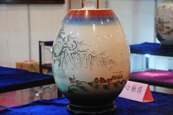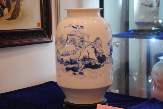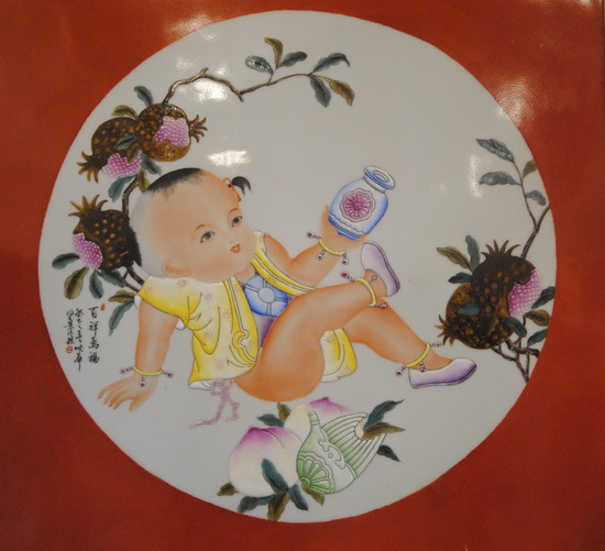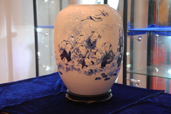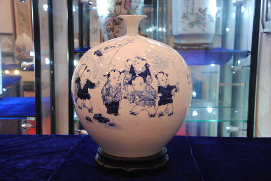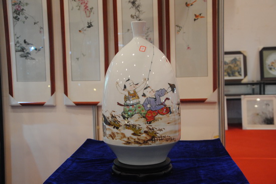 楊曉華先生十一歲開(kāi)始學(xué)習(xí)陶瓷制作,至今已有三十來(lái)年,楊曉華陶瓷藝術(shù)館創(chuàng)立至今也近十年。他浸身陶瓷圣地,深耕細(xì)作,慢慢形成自己獨(dú)特的藝術(shù)風(fēng)格。嬰戲圖以?xún)和煺鏍€漫、憨態(tài)可掬的神態(tài),以及契合中國(guó)“多子多福”的傳統(tǒng)觀念而深受大眾歡喜。此次展覽展出了楊曉華各種嬰戲圖瓷瓶、瓷板畫(huà)作品,作品線條洗練,更符合現(xiàn)代人簡(jiǎn)約的審美觀,而神態(tài)的刻畫(huà)更是生動(dòng)、傳神,聊聊數(shù)筆就使兒童的呆萌、可愛(ài)躍然瓷上。瓷畫(huà)的傳神,配上素潔的瓷面,以及梅瓶、膽瓶、棒槌瓶、蒜頭瓶、象腿瓶等多姿多彩的器型,給人以雅致、動(dòng)人的感覺(jué)。