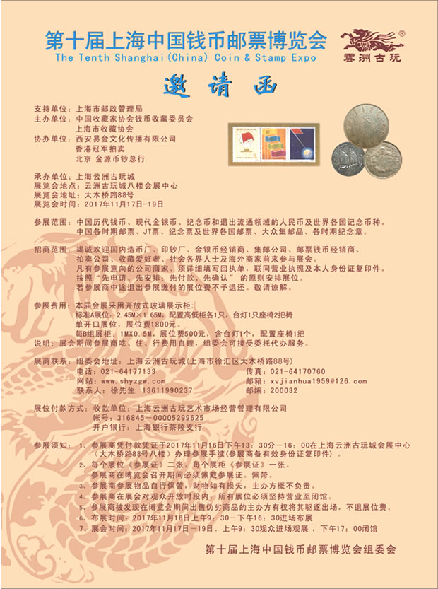 由上海市郵政管理局為支持單位,中國收藏家協(xié)會錢幣收藏委員會、上海市收藏協(xié)會主辦,北京金源幣鈔總行、上海國欣拍賣有限公司、上海市收藏協(xié)會股票債券專委會、香港冠軍拍賣、西安易金文化傳播有限公司協(xié)辦,云洲古玩城承辦的第十屆上海中國錢幣郵票博覽會將于11月17日至19日在云洲會展中心盛大開幕。