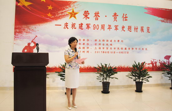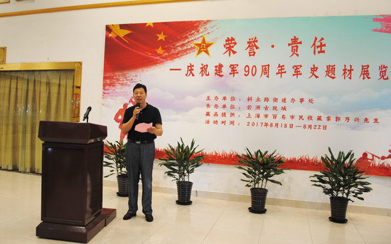 2017年8月18日,由斜土路街道辦事處主辦、云洲古玩城承辦的“榮譽(yù)·責(zé)任”——慶祝建軍90周年軍史題材展覽啟動(dòng)儀式在云洲八樓會(huì)展中心舉行。斜土街道辦事處武裝部長(zhǎng)李育民,新徐匯(集團(tuán))有限公司副總經(jīng)理蔡薏,展品提供人、上海市百名收藏家郭乃興等領(lǐng)導(dǎo)和嘉賓出席了啟動(dòng)儀式。斜土街道社區(qū)干部、斜土街道共建部隊(duì)官兵、幾十名優(yōu)撫對(duì)象和斜土社區(qū)居民及藏友參加了啟動(dòng)儀式,滬上媒體對(duì)展覽進(jìn)行了專(zhuān)門(mén)報(bào)道。