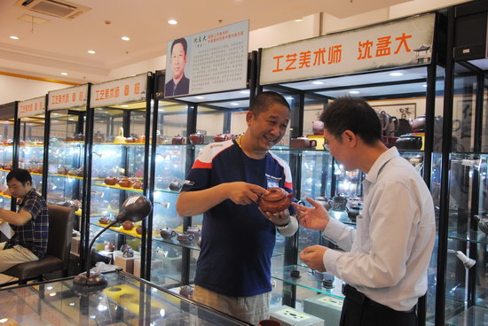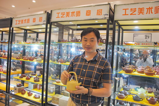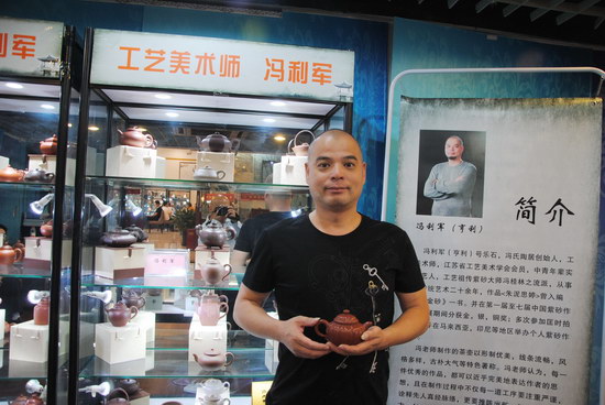 馮氏陶居創(chuàng)始人馮利軍為工藝美術(shù)師,江蘇省工藝美術(shù)學(xué)會(huì)會(huì)員,傳承紫砂大師馮桂林之流派,從事紫砂藝術(shù)二十余年,代表作《朱泥思婷》曾編入《紫玉金砂》一書(shū),并在第一至七屆中國(guó)紫砂作品藝術(shù)展期間分獲金、銀、銅獎(jiǎng);多次參加匡時(shí)拍賣會(huì),并在馬來(lái)西亞、印尼等地區(qū)舉辦個(gè)人紫砂作品展。他的紫砂作品選用上好的宜興紫砂泥料,胎質(zhì)肌理細(xì)膩柔和,顆粒分布均勻,色澤溫潤(rùn)。紫砂壺作品外觀沉穩(wěn)、大氣,古雅、宜人。在展會(huì)現(xiàn)場(chǎng),藏友們對(duì)他的壺十分贊賞。有位藏友手持他的一把小石瓢壺,反復(fù)摩挲,喜愛(ài)不已。那行云流水般的線條和鮮艷油潤(rùn)的朱砂泥,讓人愛(ài)不釋手。