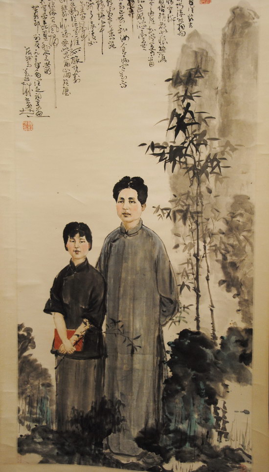 恰逢國(guó)慶和中秋“雙節(jié)日”,畫(huà)家也用新作來(lái)慶祝佳節(jié)。王建偉的紅柿子、菊花與酒,靳雪丹的松風(fēng)、明月、鳥(niǎo)語(yǔ),寫(xiě)意的豪放與工筆的抒情相得益彰。許藝城輕鎖眉頭的推敲詞句的李清照、竹石旁深情相依的毛澤東與李開(kāi)慧,劉匯茗仰天開(kāi)懷的布袋和尚,在相似的筆墨里面,你總能看到畫(huà)家對(duì)生活新的思考,對(duì)藝術(shù)新的追求。