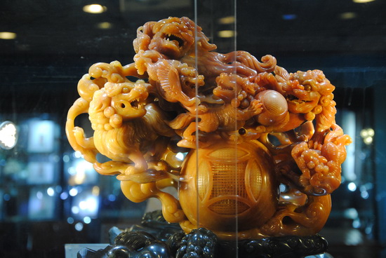 青田石產(chǎn)于浙江青田,是中國(guó)的四大印章石之一。六朝以來(lái),青田石受到人們的青睞,特別是民國(guó)以來(lái),被文人墨客極度推崇。獨(dú)特的地理?xiàng)l件賦予青田石無(wú)比絢爛和溫潤(rùn)的色彩,這些令人賞心悅目的色彩又被人們賦予別具一格的名字:封門青、燈光凍、蘭花青、黃金耀、美人紅、封門三彩等。青上閣石雕藝術(shù)精品展展出了近千余件青田石雕作品,仿佛一個(gè)巨大的調(diào)色盤,將大自然所有的色彩杰作收羅其中。