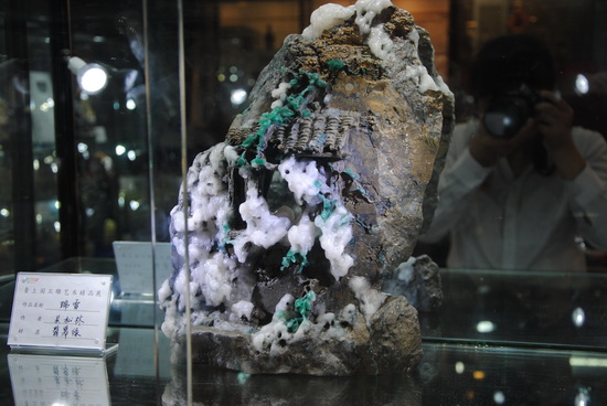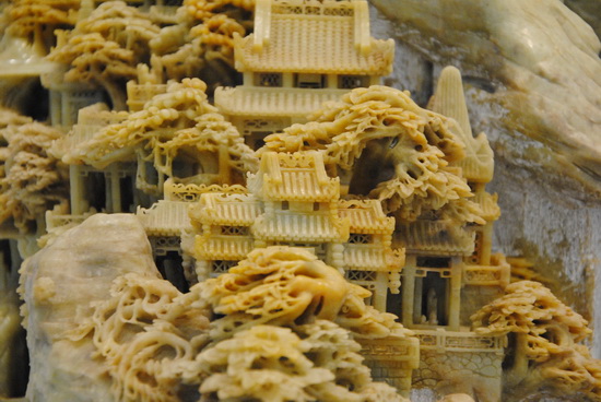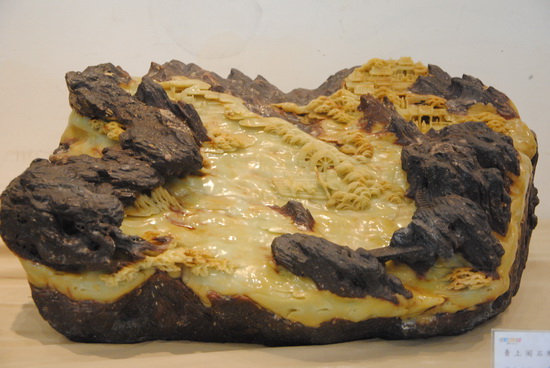 主辦方青上閣以匠人特有的刻苦,揣摩青田石本身的色彩和肌理,結(jié)合自己對(duì)生活的理解和大眾的需求,隨形奏刀,既推出了有吉祥寓意的《連年有余》、《龍騰盛世》等傳統(tǒng)佳作,又根據(jù)現(xiàn)代人對(duì)田園生活的向往,推出了《青翠欲滴》、《蛙聲一片》等作品。巨型青田石雕《踏秋》所采用原石體型巨大,約有一米高,雕工精細(xì),緊湊的分布著亭臺(tái)、閣樓、高塔、路橋,以及松林花果,無(wú)一不精致。雖然小亭高不盈寸,但是菱形圍欄,微翹的屋檐,一點(diǎn)都不含糊,顯示出作者卓越的藝術(shù)造詣。