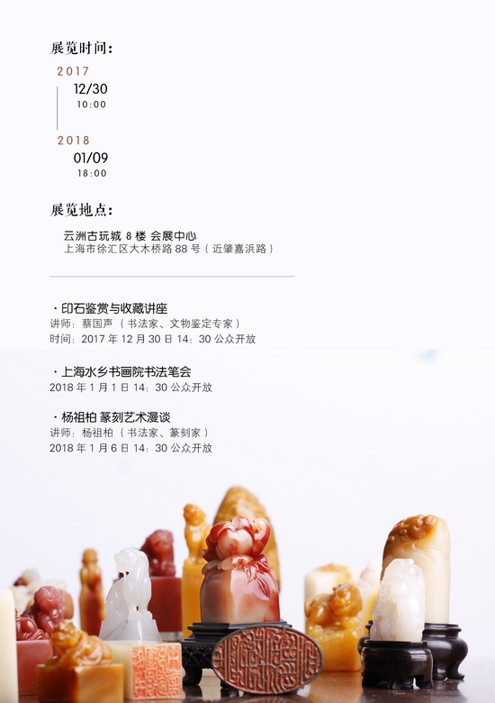 本次展會匯集了潘驚石、周鴻、鄭國鋒、鄭則耀等多位石雕藝術(shù)名家的佳作,展出精品壽山石、老撾石等印章、擺件千逾件。展會期間將邀請文物鑒定專家蔡國聲、海上小刀會成員篆刻家楊祖柏等業(yè)內(nèi)知名人士蒞臨現(xiàn)場并作專題講座,為您細(xì)細(xì)講述印石藝術(shù)的鑒賞、收藏與篆刻之道。元旦當(dāng)天,還將舉行上海水鄉(xiāng)書畫院書法筆會,書畫名家們雅集云洲,揮毫潑墨,是喜愛金石文化的藏友不可錯過的交流盛會。