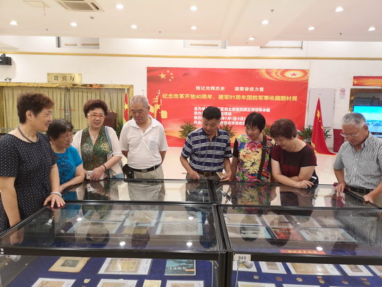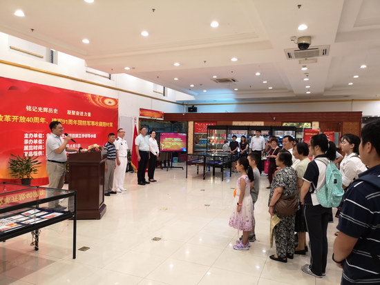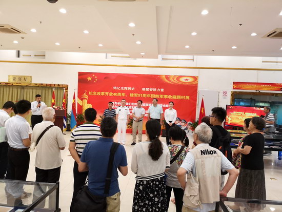 隨后,本次展覽展品提供者——上海市百名市民收藏家郭乃興發(fā)言。他介紹本次展覽圍繞建軍91周年和改革開(kāi)放40周年,分紅軍、土地改革、改革開(kāi)放等六大主題展示了中國(guó)軍隊(duì)和國(guó)家的輝煌歷史。并稱本次展覽雖是街道主辦,但展品卻是市級(jí)展覽的水平。