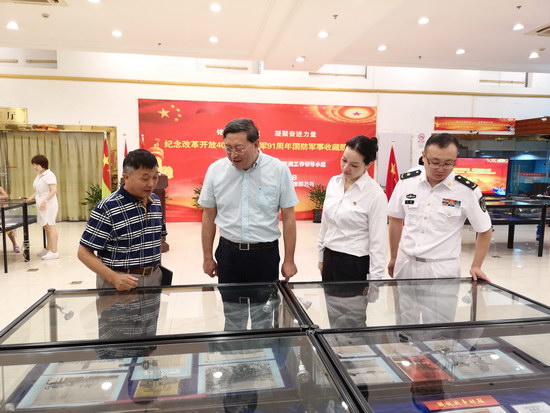 為了慶祝改革開(kāi)放40周年、中國(guó)人民解放軍建軍91周年,由徐匯區(qū)斜土路街道辦事處與云洲古玩城攜手共同舉辦的《銘記光輝歷史、 凝聚奮進(jìn)力量》國(guó)防軍事收藏題材展開(kāi)幕式于8月1日上午在云洲古玩城八樓會(huì)展中心舉行。斜土街道黨工委副書(shū)記、辦事處主任王萬(wàn)金,常征醫(yī)院泌尿外科副教授陰雷,新徐匯集團(tuán)副總經(jīng)理、云洲古玩城董事長(zhǎng)周杰,云洲古玩城副董事長(zhǎng)兼副總經(jīng)理王莉璟,以及社區(qū)優(yōu)撫對(duì)象代表、離休老干部代表、社區(qū)中小學(xué)生代表等出席了開(kāi)幕式。