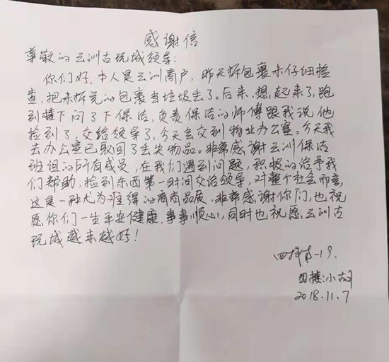 你們好,本人是云洲古玩城四樓南-19的商戶,2018年11月6日我在拆包裹時(shí)未仔細(xì)檢查,把未拆完的包裹當(dāng)垃圾扔了。后來想起來了,包裹里可能還有東西沒拿走就仍了,跑到樓下問了一下保潔員,是否看到這一包垃圾,負(fù)責(zé)保潔的師傅跟我說,他在整理垃圾時(shí)看到這個(gè)包裹,且里面有東西,他想可能是哪個(gè)商戶粗心了,馬上就把包裹交給保潔值班長(zhǎng)了,由班長(zhǎng)轉(zhuǎn)交給物業(yè)部領(lǐng)導(dǎo),叫我去物業(yè)辦公室找領(lǐng)導(dǎo)領(lǐng)回,當(dāng)天我去辦公室取回了丟失的物品。在此,非常感謝云洲保潔班組的所有成員,在我們遇到問題時(shí),積極的給予我們幫助,撿到東西第一時(shí)間交給領(lǐng)導(dǎo),對(duì)整個(gè)社會(huì)而言,這是一種尤為難得的高尚品質(zhì),非常感謝你們,也祝你們一生平安健康,事事順心,同時(shí)也祝愿云洲古玩城越來越好!