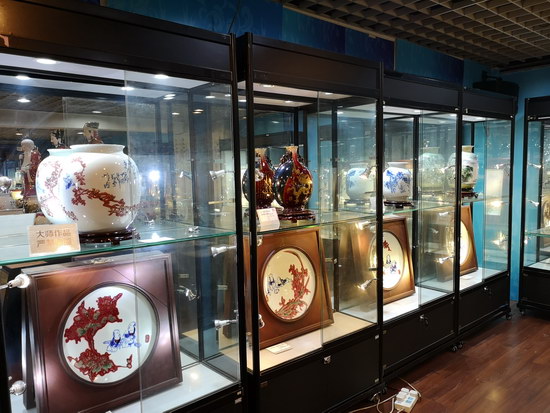 展覽展出了葉兆云大師的多件瓷畫作品。他的古彩瓷畫已經(jīng)爐火純青,現(xiàn)代彩作品《峽谷牧羊》更讓人眼前一亮。大西北的雄渾、廣袤的褐黃色土地,奔跑的白色羊群,蓬勃的生命力仿佛要跳出畫框,其中的視覺美感令人心醉。他采用傳統(tǒng)的柴燒技藝燒制的作品發(fā)色濃麗、器型或娟小或豪放,別有一番韻致!