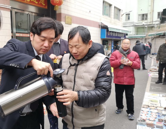 2019年1月3日,是云洲新年第一場(chǎng)周四露天淘寶集市。氣溫低回,但淘寶人的熱情不減,淘寶集市上依舊是人聲鼎沸,熱鬧非凡。為了給寒風(fēng)中忙生意的攤主們送去溫暖,市場(chǎng)部的小伙子們?yōu)樗麄兯蜕吓慕?。有些攤主在收到姜茶時(shí)開(kāi)心的說(shuō):“即使零下十度也感覺(jué)像零上十度一樣暖!”
