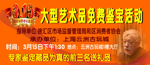 又到每年一度的“3•15”國(guó)際消費(fèi)者權(quán)益日了,為滿(mǎn)足市民對(duì)古玩藝術(shù)品的鑒賞需求、提高廣大藏友的藝術(shù)品鑒水平,上海云洲古玩城秉持傳統(tǒng),于維權(quán)日當(dāng)天的13:30至16:00,在云洲一樓大廳舉行“3•15”消費(fèi)者權(quán)益日大型藝術(shù)品免費(fèi)鑒定活動(dòng)。