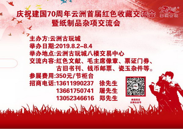 為迎接建國70周年,云洲古玩城將于2019年8月2日至4日在八樓交易中心舉辦首屆紅色收藏交流會暨紙制品雜項交流會。屆時,將展出紅色文獻、毛主席像章、票證門券、古舊書刊、錢幣郵票、瓷玉雜件等紅色收藏品。