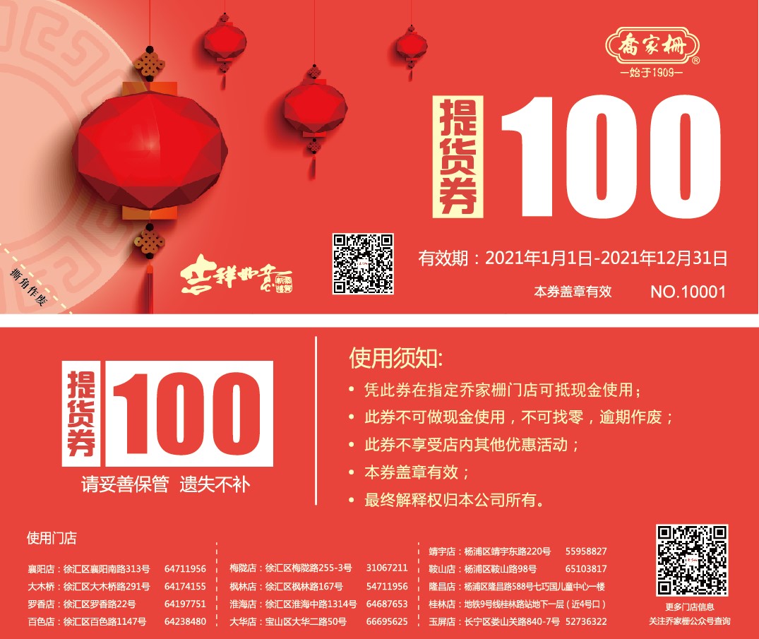 三等獎 老字號“喬家柵”現(xiàn)金抵用券(2張)
