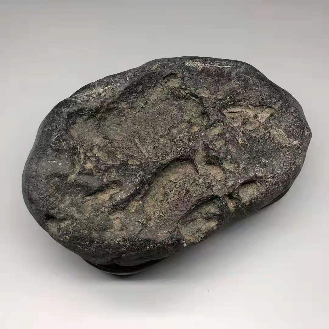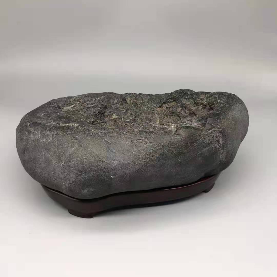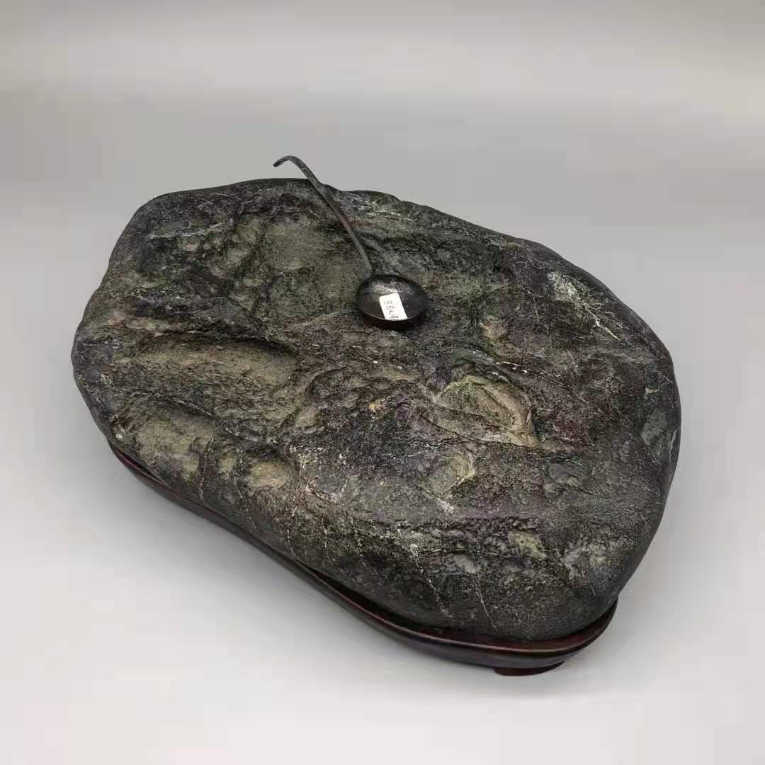 其出于溪水之中,石之表層隱隱見如水波之紋理,也正因長(zhǎng)年受水流浸潤(rùn),才能得此深翠秀潤(rùn)之質(zhì)地。此石兩面修治平坦,四周巖壑起伏,褶皺與各深淺之坑排迭緊密,參差嶙峋之間又有萬仞氣象。奇石臺(tái)面間的孔坑大小深淺不一,恰似山巒間的池塘,令人嘖嘖稱奇。