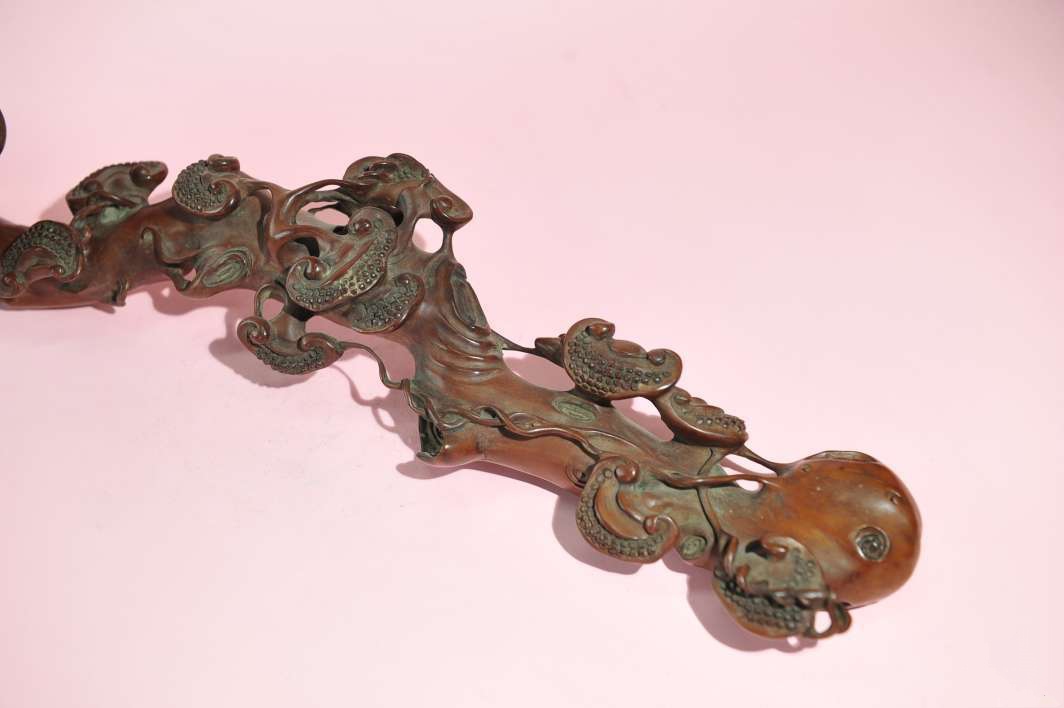 爐身口沿環(huán)繞一周回紋工,下有20個(gè)手刻獸面饕餮紋作裝飾,爐耳更以造型逼真的六朵靈芝來襯托,寓意富貴安康。此件器物的制造工匠定是精心勾畫,才做出了這樣一件匠心獨(dú)運(yùn)的佳作。也可見其原主人的非凡地位,必屬貴族或郡王的定制之物,具有不可替代的唯一性。