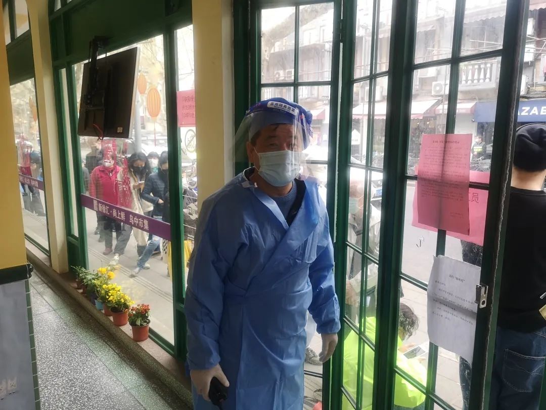 維持市場秩序、控制人流、測溫驗(yàn)碼,要求顧客規(guī)范佩戴口罩,反復(fù)講解防疫要求。