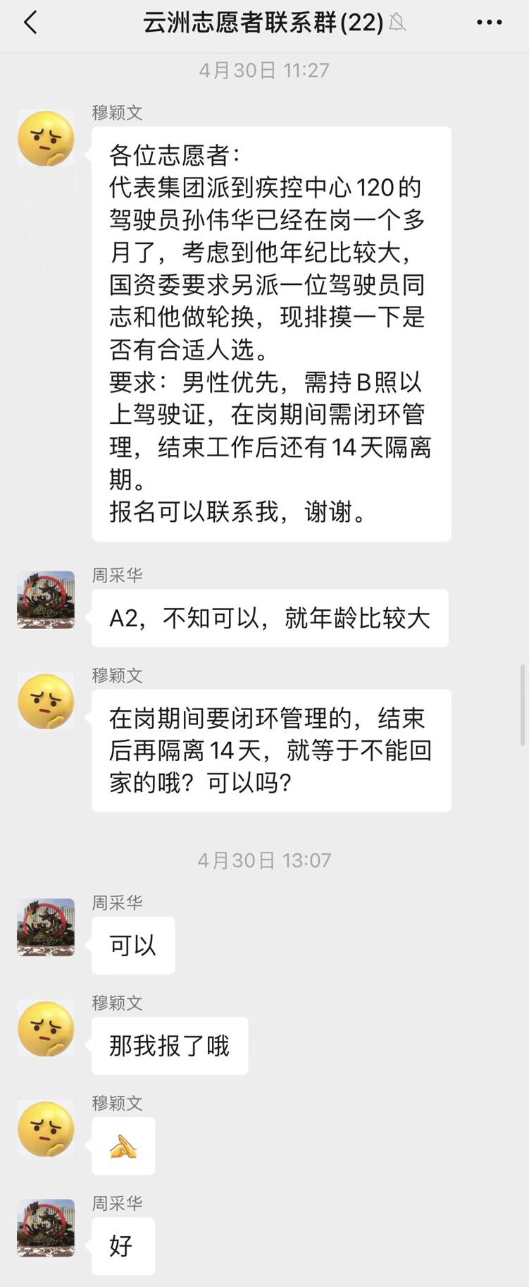 周采華作為一名黨員、老云洲人,第一時間沖在前面,用實(shí)際行動詮釋了什么是“一個黨員一面旗”。從3月21日起,周采華就持續(xù)活躍在不同的志愿者崗位上。4月30日,云洲志愿者聯(lián)系群發(fā)布了一則集團(tuán)轉(zhuǎn)發(fā)的疾控中心招募駕駛員的通知,明知轉(zhuǎn)運(yùn)志愿者要求封閉式管理,任務(wù)結(jié)束后還需要隔離14天才能回家,周采華還是第一時間就主動報(bào)了名。