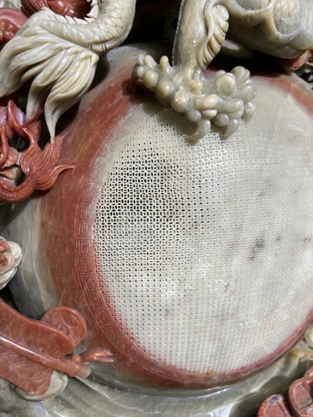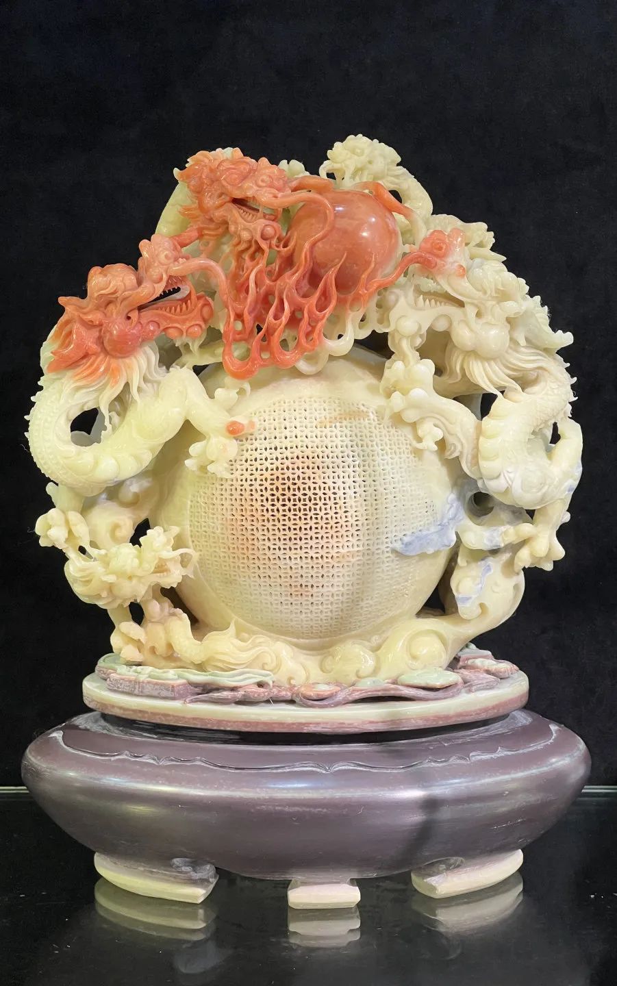 中國工藝美術大師張愛廷的大型青田石雕作品《神龍護寶》在展廳內十分引人注目。聚寶盆之上,神龍盤繞在寶珠周圍,每一鱗片都被雕刻得栩栩如生;寶珠正面是細密的鏤空方孔錢紋,透過中空內膛顯示出背面“歡天喜地”四字。據(jù)介紹這一件高65厘米的巨作歷經數(shù)年創(chuàng)作,處處表現(xiàn)出藝術家對細節(jié)的極致追求。這不僅僅是一件雕刻,更是對時間、生命的深刻沉思。