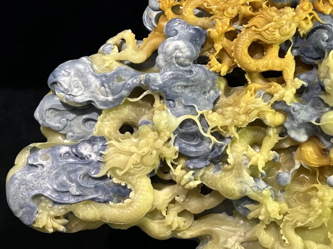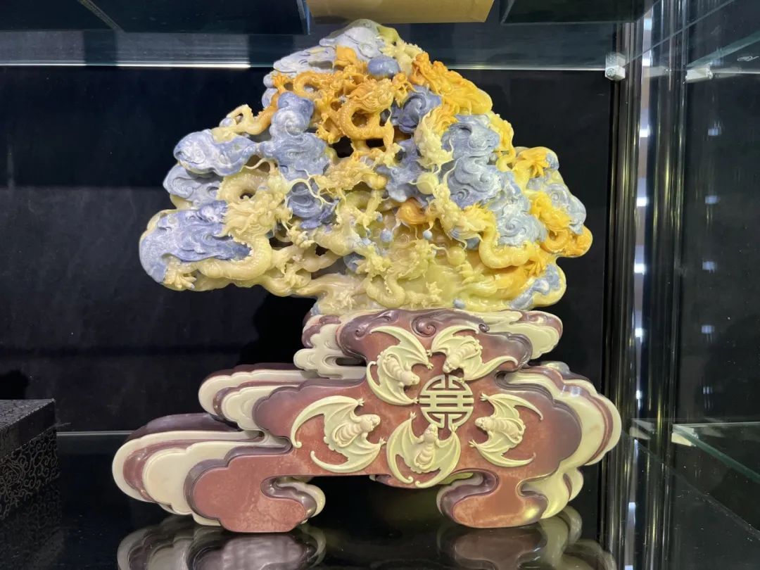 走進展廳,每一件青田石石雕作品在燈光的投射下被勾勒出層次分明的輪廓和豐富多彩的顏色,營造出莊重的氛圍。展廳內大多數(shù)都是大師艾建春的作品,他從17歲時開始學習雕刻,已經有近30年經驗了,他擅長飛禽走獸類的雕刻,特別是龍的題材?,F(xiàn)場展出的青田石雕刻作品《龍騰盛世》和《祥龍獻瑞》,都可見他的精湛技藝。其中《龍騰盛世》曾獲全國工藝美術博覽會金獎。