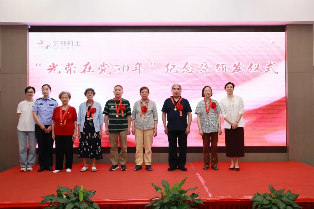 活動(dòng)在莊嚴(yán)肅穆的勛章頒授儀式中拉開(kāi)序幕,6位“光榮在黨50年”的老黨員精神矍鑠地走上舞臺(tái),斜土街道黨工委副書(shū)記秦敏、紀(jì)工委書(shū)記李瑩、派出所副所長(zhǎng)翁敏杰將承載五十載歲月沉淀、見(jiàn)證信仰堅(jiān)守的勛章佩戴于老黨員胸前,向臺(tái)下年輕黨員們傳遞著對(duì)黨忠誠(chéng)、矢志不渝的精神力量,現(xiàn)場(chǎng)掌聲如潮,久久不息。