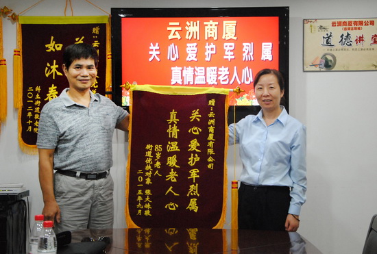9月10日下午,日暉七村張大妹老人的兒子在居委會章書記、邱主任的陪同下,向云洲商廈贈送錦旗一面。云洲商廈黨總支副書記、工會主席蔣蓉代表云洲接受錦旗,并表示一定會一如既往的關(guān)愛張大妹老人,讓老人健康快樂的頤養(yǎng)天年。