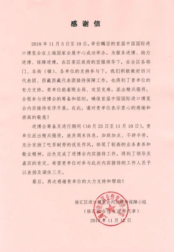 為了感謝云洲商廈對進博會工作做出的貢獻,徐匯區(qū)進口博覽會內(nèi)賓接待保障小組發(fā)來一封《感謝信》,對負責內(nèi)賓接待的云洲志愿者予以表揚,并對云洲給予的大力支持和幫助給予感謝!