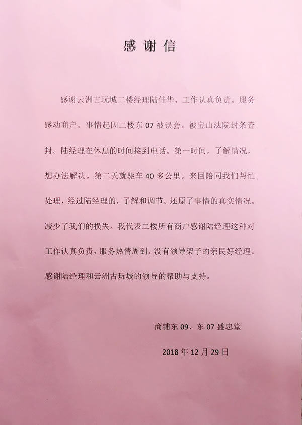 新年伊始,云洲市場部的業(yè)務(wù)主管陸佳華收到云洲古玩城的二樓盛忠堂商戶送來的一面錦旗和一封感謝信。