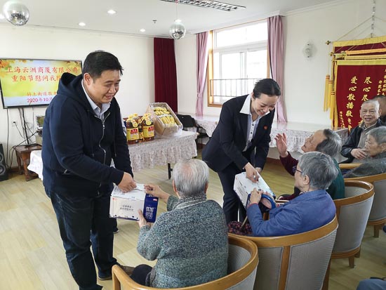 2020年10月23日,重陽節(jié)前夕,云洲開展重陽節(jié)敬老活動,傳達對老年人的關(guān)愛。上午,云洲商廈黨支部書記、總經(jīng)理王莉璟帶領(lǐng)云洲新一屆領(lǐng)導(dǎo)班子成員和部分職工前往斜土街道敬老院和新徐匯樂爾之家(徐匯區(qū)悅頤養(yǎng)老院)慰問老人,下午,公司又召開云洲老年商戶座談會并送上慰問品。