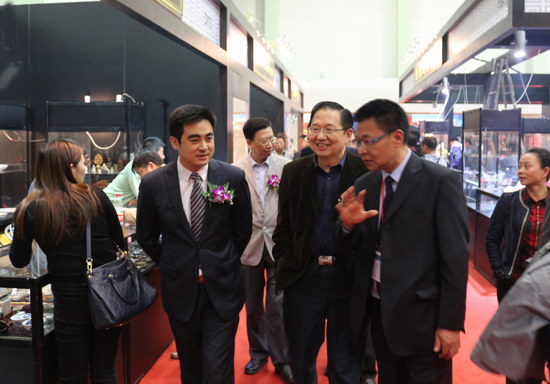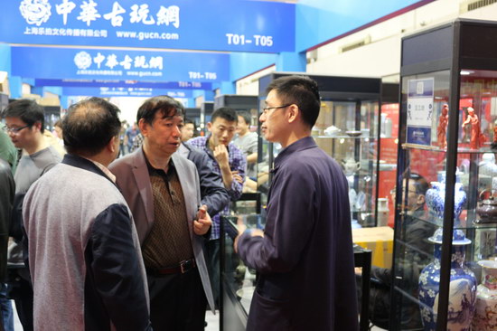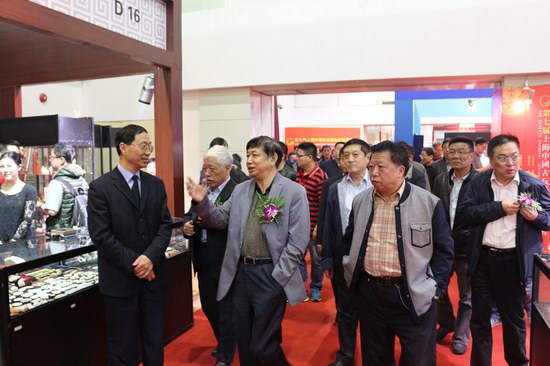 上海市政協(xié)副秘書(shū)長(zhǎng)、民進(jìn)市委專職副主委許政濤(左三)在上海云洲古玩城副總經(jīng)理吳中澤的陪同下參觀古博會(huì)