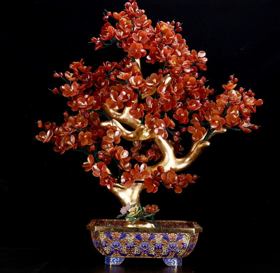 取材天然,枝干婉轉(zhuǎn)曲折,灑金包裹,梅花茂盛,疊舞盛開,瑪瑙做瓣,黃玉做蕊,色澤迷人,意境優(yōu)美典雅,栩栩如生,盆內(nèi)鋪灑瑪瑙、水晶,碧玉等,做工考究細膩,韻味無窮,陳列展示佳品。