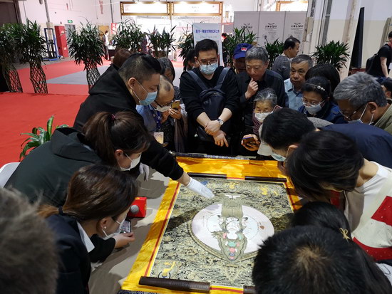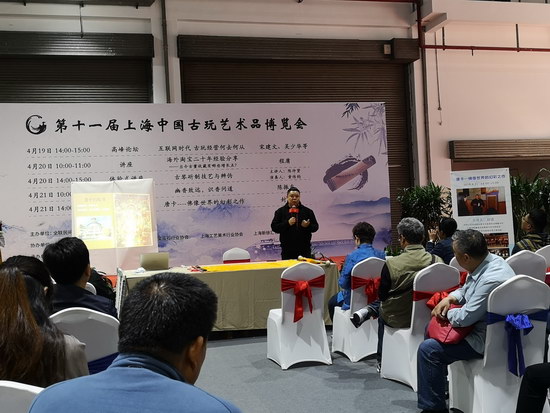 下午,由中國工藝美術(shù)協(xié)會唐卡專業(yè)委員會副秘書長、上海市收藏協(xié)會承棠唐卡傳習(xí)所所長封雷主講《唐卡——佛像世界的幻彩之作》講座。封雷及其助手介紹了唐卡文化的誕生與發(fā)展,唐卡的繪制工藝,唐卡中展現(xiàn)的佛教文化。最后,封雷還展示了他悉心收藏的名家唐卡作品,讓藏友們親眼領(lǐng)略唐卡藝術(shù)的魅力。