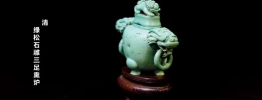 展區(qū)內(nèi),閑庭信步之間,就發(fā)現(xiàn)了一個(gè)漂亮的小玩意——清·綠松石雕三足熏爐。這款三足熏爐所用的綠松石原料質(zhì)地細(xì)膩、純凈,色澤純正、鮮艷,采用傳承千年的雕刻技藝,三足清晰、自然,熏爐體態(tài)優(yōu)美。雖小,立于掌中,別有一番風(fēng)味。