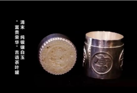 因“金玉良緣”而眾所周知的金鑲玉是兩大器物的絕配之作。銀鑲玉則作為另一種親民的不同器物之間搭配而成的組合,早在古代也頗為流行。本屆古博會(huì)上的一款 清末·純銀鑲白玉“富貴榮華”吉語(yǔ)茶葉罐,即是這種組合。圓罐蓋子頂部鑲嵌有一整塊鏤雕工藝的清末白玉,純銀的蓋身以及罐桶散發(fā)著時(shí)光沉淀的光芒,柔和又溫暖。