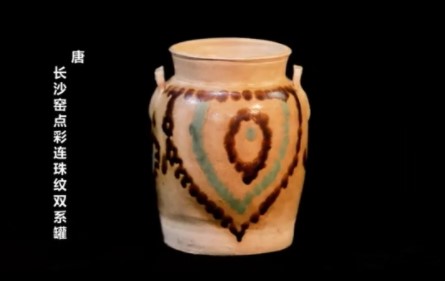 長(zhǎng)沙窯是建國(guó)以來(lái)新發(fā)現(xiàn)的唐代重要瓷窯之一,源遠(yuǎn)流長(zhǎng)的楚文化是其根基,敦實(shí)的造型,寫意的裝飾圖案是楚地民風(fēng)生動(dòng)活潑的寫照。展會(huì)現(xiàn)場(chǎng)的這款 唐·長(zhǎng)沙窯點(diǎn)彩連珠紋雙系罐,造型豐滿,壺頸偏短,壺腹體大,更顯敦實(shí)和莊重大方,有著一種陽(yáng)剛之美。