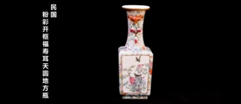 粉彩主要用于繪制粉畫,色彩明快,顏色種類多,筆觸類似油畫。粉彩的藝術(shù)效果,以秀麗雅致、粉潤(rùn)柔和見(jiàn)長(zhǎng),并且與潔白精美的瓷器相互襯托,相映成趣。回流展位里的一件民國(guó)·粉彩開(kāi)框福壽耳天圓地方瓶很好的詮釋了這份秀麗與柔和。