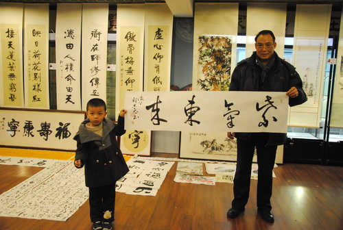 畫展期間,主辦方還推出了抽獎活動。開幕首日一位小朋友就幸運(yùn)抽得海派書畫家程共飛作品并與畫家合影。畫展于3月23日結(jié)束。