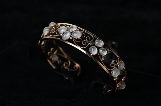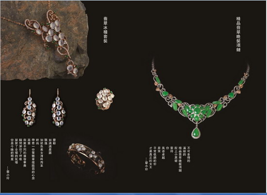 展會(huì)上展出的千余件翡翠精品,包括:高貴典雅的翡翠晚裝套裝、經(jīng)典靈動(dòng)的翡翠掛墜、別致尊貴的翡翠戒指、韻味十足的翡翠手鐲、別具靈韻的手玩件和大小擺件、散發(fā)著濃濃文化氣息的翡翠方牌及對(duì)牌等。其中更是不乏諸如“生意興隆”擺件等翡翠精品。該作品選用帶有黃翡飄藍(lán)花、紫羅蘭飄藍(lán)花的原石雕琢而成,兩種質(zhì)地融于一塊原石,這在翡翠界里是十分稀有的;工藝上則運(yùn)用巧雕、圓雕技術(shù)刻成金燦燦的如意和紫氣東來(lái)的龍頭,使整件作品栩栩如生,寓意吉祥。