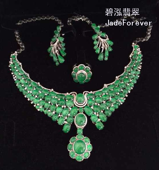 晚裝鏈套裝系列點(diǎn)亮整個(gè)翡翠展。其中一件名為“阿凡達(dá)之王”的晚裝鏈套裝更成為全場(chǎng)焦點(diǎn)。項(xiàng)鏈由上百顆翡翠珠子鑲嵌而成。所有珠子來(lái)自同一塊石料,綠色濃艷純正、顆顆飽滿晶瑩,在燈光的映照下光彩動(dòng)人。項(xiàng)鏈的形狀如鳳凰展翅,又如蔥郁的密林。整個(gè)設(shè)計(jì)正如它的名字一樣新奇而充滿想象力。項(xiàng)鏈還有配套的耳環(huán)和戒指。正如碧泓翡翠創(chuàng)始人蔡小玲所介紹的一樣,戴上它,你就會(huì)展現(xiàn)“與眾不同的雍容華貴,瞬間凝聚全場(chǎng)的氣場(chǎng)?!弊髌肺撕芏嗯圆赜眩€有外地藏友電話征詢。同樣奪人眼球的還有滿綠翡翠福祿(葫蘆)套裝,滿綠翡翠平安扣套裝,滿綠紫羅蘭翡翠套裝等,或古韻盎然,或活潑靈動(dòng),或淡雅大氣,每一種都盡顯翡翠的天然之美和設(shè)計(jì)師的巧妙構(gòu)思。