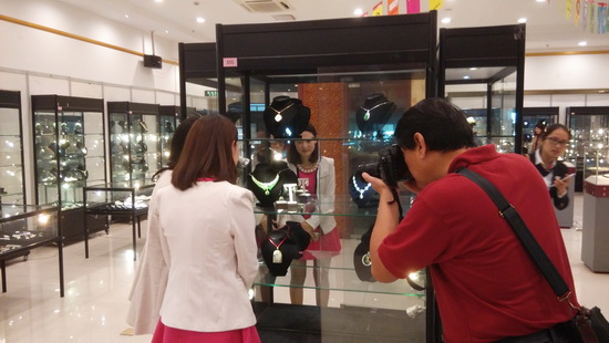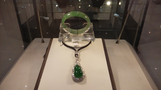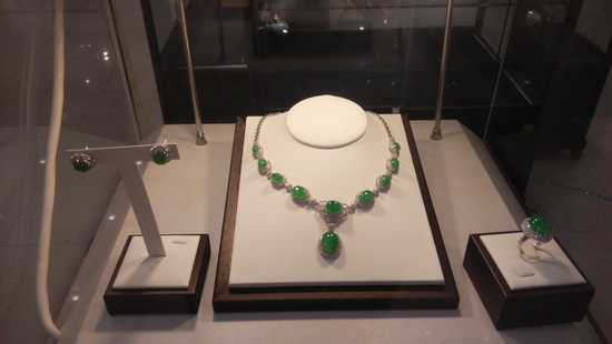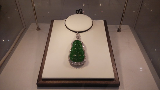此次展出的翡翠作品涵蓋翡翠吊墜、方牌、戒指、手鐲、把件、擺件、晚裝鏈套裝等。上乘的翡翠材質(zhì)令參觀者們大開(kāi)眼界。帝王綠翡翠, 罕見(jiàn)的春帶彩翡翠, 顏色均勻、質(zhì)地細(xì)膩的黃翡等令人嘖嘖贊嘆。充滿創(chuàng)意的設(shè)計(jì)也是翡翠展的一大亮點(diǎn):剔透晶瑩的滿綠翡翠18K金和鉆巧妙的連接在一起,形成一個(gè)豎著小耳朵、系著小領(lǐng)結(jié)的可愛(ài)貓咪,令時(shí)尚美女們愛(ài)不釋手。