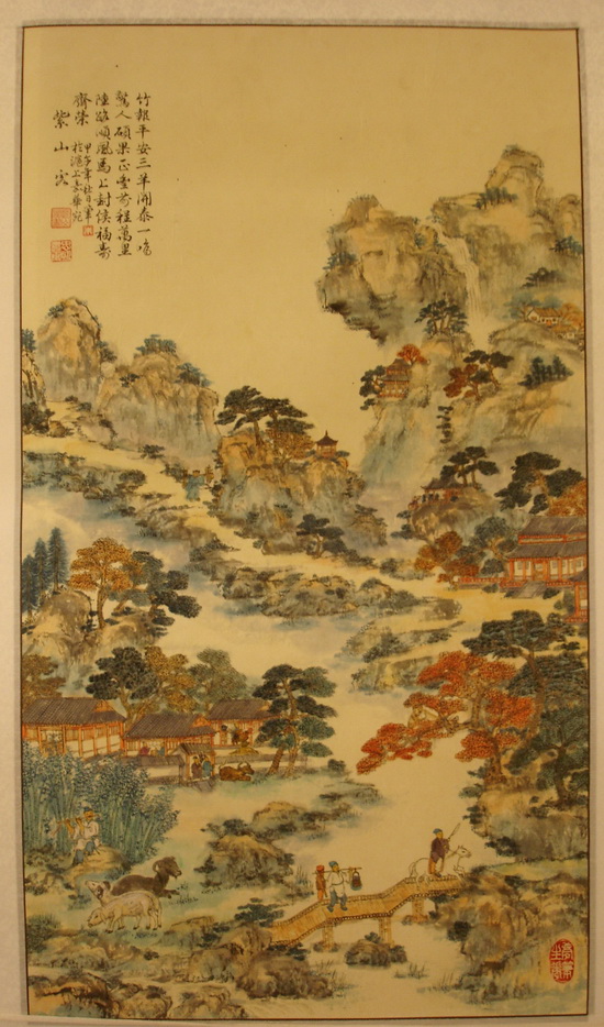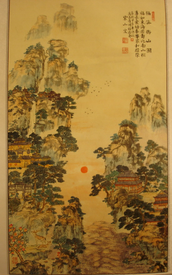 書畫家朱忠明更是在用紙、畫面布局,以及書畫傳遞的美好寓意上用足功夫。他的畫作《福海壽山圖》是一幅獻(xiàn)給長(zhǎng)者的祝壽圖。他采用了是大家不常用的木紋紙,粗糙的紋理反倒給人一種古拙感,為畫面更添韻味。畫面的布局也十分精心。整個(gè)畫面分為三個(gè)層次,遠(yuǎn)處的群山與飛鳥,中間的廟宇與樓閣,近處的梅花鹿與壽桃。觀之,旭日東升,松柏青青,桃果鮮嫩,梅鹿徜徉,廟堂梵音……一派寧?kù)o祥和,怎不令人神往?這不愧為一幅令長(zhǎng)者悅心之作。