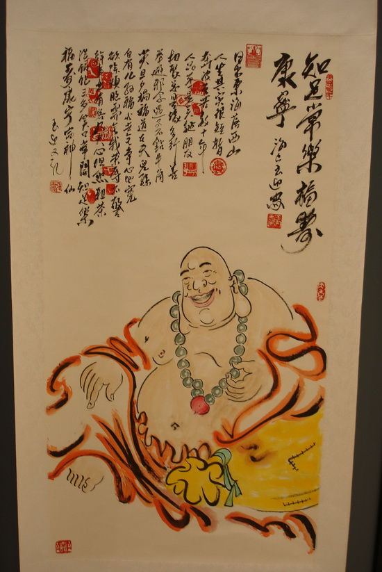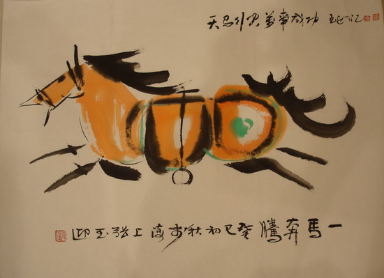 上海徐悲鴻藝術(shù)中心藝術(shù)顧問(wèn)張玉迎以毛體書法見長(zhǎng)。他的書法作品豪邁超凡,自然流美,擁有眾多粉絲。他的畫作亦濃墨重彩,大筆寫意,頗有逸趣。畫作《一馬奔騰》幾筆就刻畫出一批風(fēng)馳電掣般飛奔的馬兒。他用墨線勾出豎起的馬耳,飛揚(yáng)的馬鬃和馬尾,騰空飛奔的馬腿,用橙色描繪馬兒漂亮的高昂的馬首,漂亮的馬身和緊實(shí)的馬臀。相信有了這匹馬兒,一定會(huì)馬到成功。