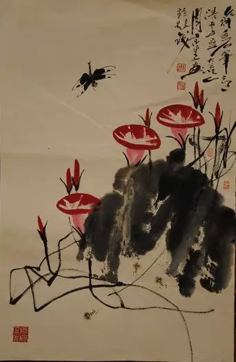 周京生難得一見(jiàn)的果蔬圖創(chuàng)作,在水墨內(nèi)涵與形色表現(xiàn)上均很成功。橫臥的白菜與豎置的紅柿,在視覺(jué)上有一種空間的立體呈現(xiàn),在諧音上是“事世清白”的寓意傳達(dá)。畫者心境的淡泊與坦蕩,加深了畫面質(zhì)感的通透,寥寥數(shù)筆就將果蔬形神捕盡。白菜葉濃樁淡,有筆有墨,靜態(tài)文氣。柿子兩筆圈成,一個(gè)頂朝上,一個(gè)頂朝下,活色生香。