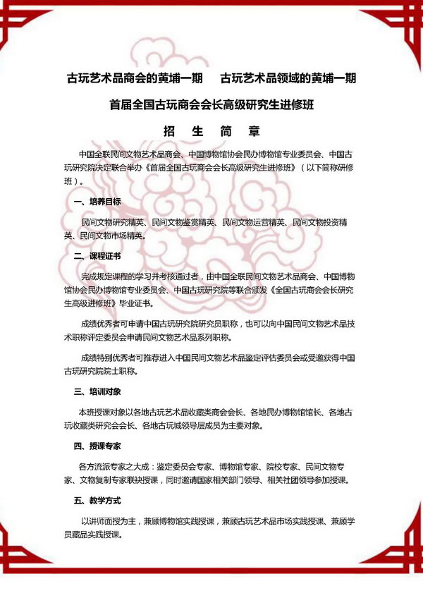 首屆全國(guó)古玩商會(huì)會(huì)長(zhǎng)高級(jí)研究生進(jìn)修班招生