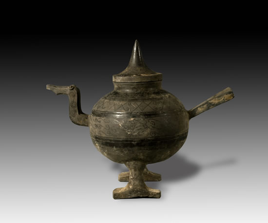 戰(zhàn)國(guó)磨光壓畫紋黑陶鴨形尊